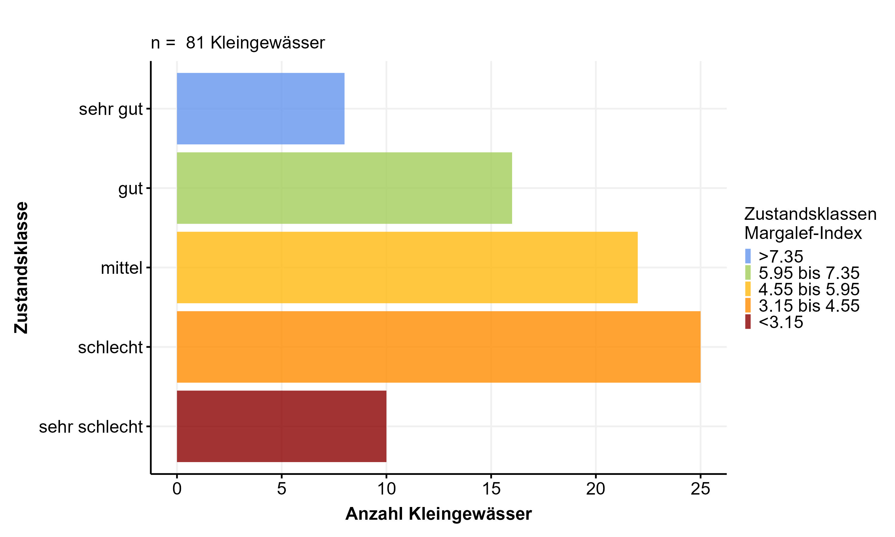 Daten des JKI zeigen eine Korrelation zwischen dem Biodiversitätsindex Margalef (DM, Margalef, 1958) und der Habitattypanzahl im Kleingewässer (KG). Der Margalef-Index lässt so einen Rückschluss auf die Habitatvielfalt im KG zu. Der Wirkungsindikator „Biodiversität und Habitatvielfalt“ beschreibt den Zusammenhang zwischen MZB- und Habitatvielfalt in KG und erlaubt so eine Einordnung der Belastung dieser durch Habitatverlust.