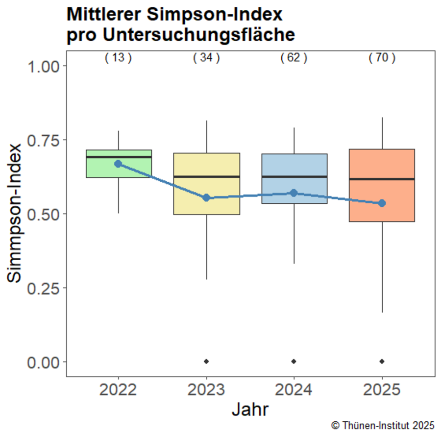 Der Simpson-Index berücksichtigt zusätzlich zum Artenreichtum auch die relative Häufigkeit der Arten und reagiert damit auf Dominanzeffekte. Dies erhöht seine ökologische Aussagekraft, da strukturelle Veränderungen in Hummelgemeinschaften erfasst werden, die für Stabilität und Funktionalität von Agrarökosystemen relevant sind. Der Simpson-Index beschreibt die Wahrscheinlichkeit, dass zwei zufällig ausgewählte Individuen einer Stichprobe derselben Hummelart angehören. Wird auf einer Untersuchungsfläche nur eine Art nachgewiesen, ergibt sich für den Simpson-Index ein Wert von 0, während sich bei einer gleichmäßigen Verteilung der Individuenzahl auf verschiedene Arten ein Wert von 1 ergibt.