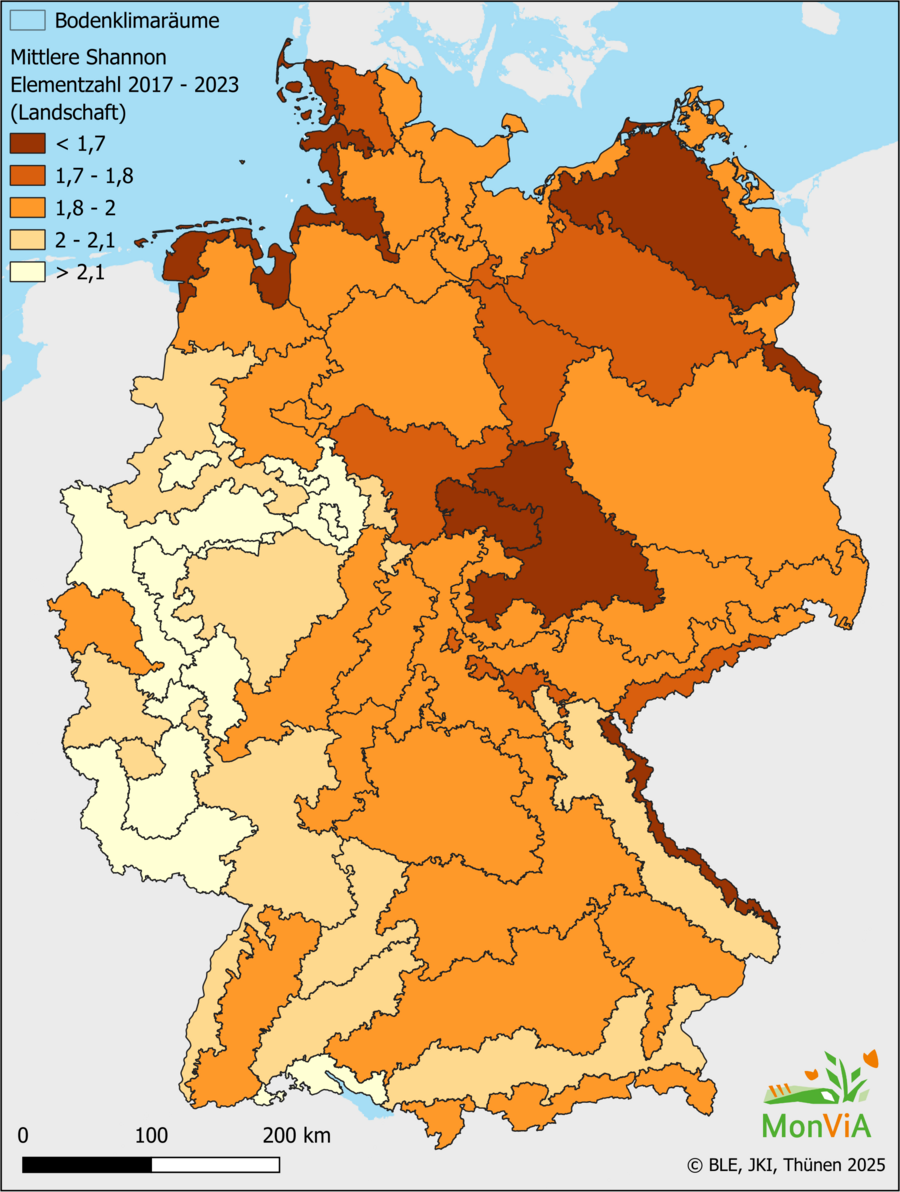Die Vielfalt der Landbedeckung beeinflusst die Qualität und Quantität von Nahrungsressourcen und Habitaten. Dies betrifft nicht nur die Heterogenität der Agrarlandschaft selbst, sondern auch der sie umgebenden Landschaftsmatrix, die Nahrungsressourcen und Habitate für in der Agrarlandschaft vorkommenden Arten bietet. Der Indikator bildet die Vielfalt der wesentlichen Landbedeckungsklassen (siehe Anhang I) in einem Landschaftsausschnitt ab. Die Quantifizierung erfolgt durch den Shannon-Wiener-Index (H)bzw. die Shannon-Elementzahl (bzw. „effektive Anzahl Klassen“ oder „Hill-Zahl“). Die räumlich hochaufgelöste Darstellung (höchste Auflösungsebene = 100 ha Hexagone) ermöglicht die Identifikation und Bewertung von räumlichen Mustern der Landbedeckungsvielfalt sowie von mittel- bis langfristigen Veränderungen (Trends).
