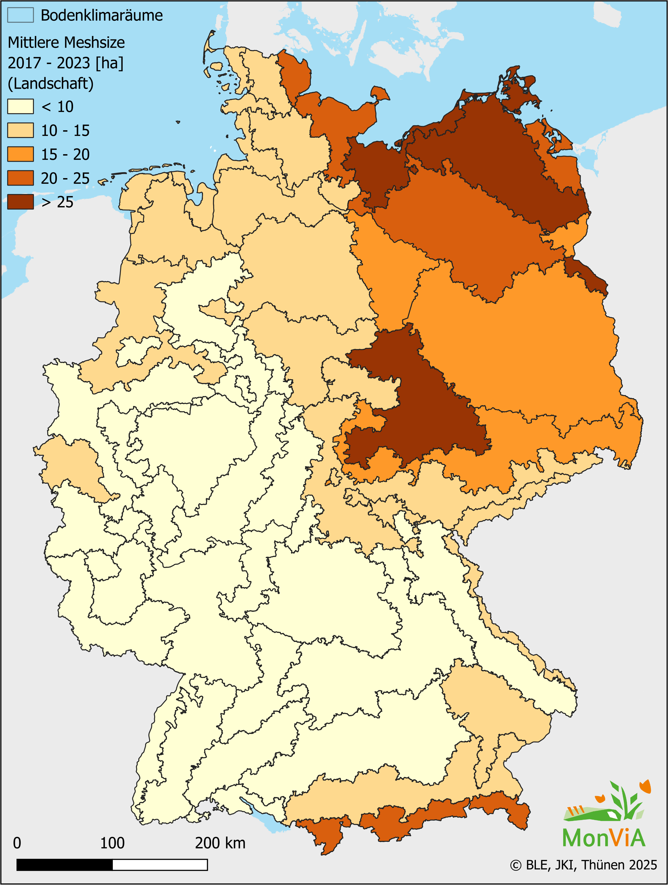 Die Vielfalt der Landbedeckung beeinflusst die Qualität und Quantität von Nahrungsressourcen und Habitaten. Dies betrifft nicht nur die Heterogenität der Agrarlandschaft selbst, sondern auch der sie umgebenden Landschaftsmatrix, die Nahrungsressourcen und Habitate für in der Agrarlandschaft vorkommenden Arten bietet. Die Konfiguration einer Landschaft kann durch die Größe und Form der Landbedeckungsklassen bzw. durch die aus diesen Parametern abgeleiteten Indizes der Vernetzung bzw. Zerschneidung (Fragmentierung) einer Bezugsfläche beschrieben werden. Als Maß für die Zerschneidung der Landschaft dient hier die effektive Mesh Size (meff). Sie gibt die Wahrscheinlichkeit an, mit der zwei zufällig ausgewählte Punkte in einer Region in einer Fläche liegen bzw. wie heterogen die untersuchte Region ist.
