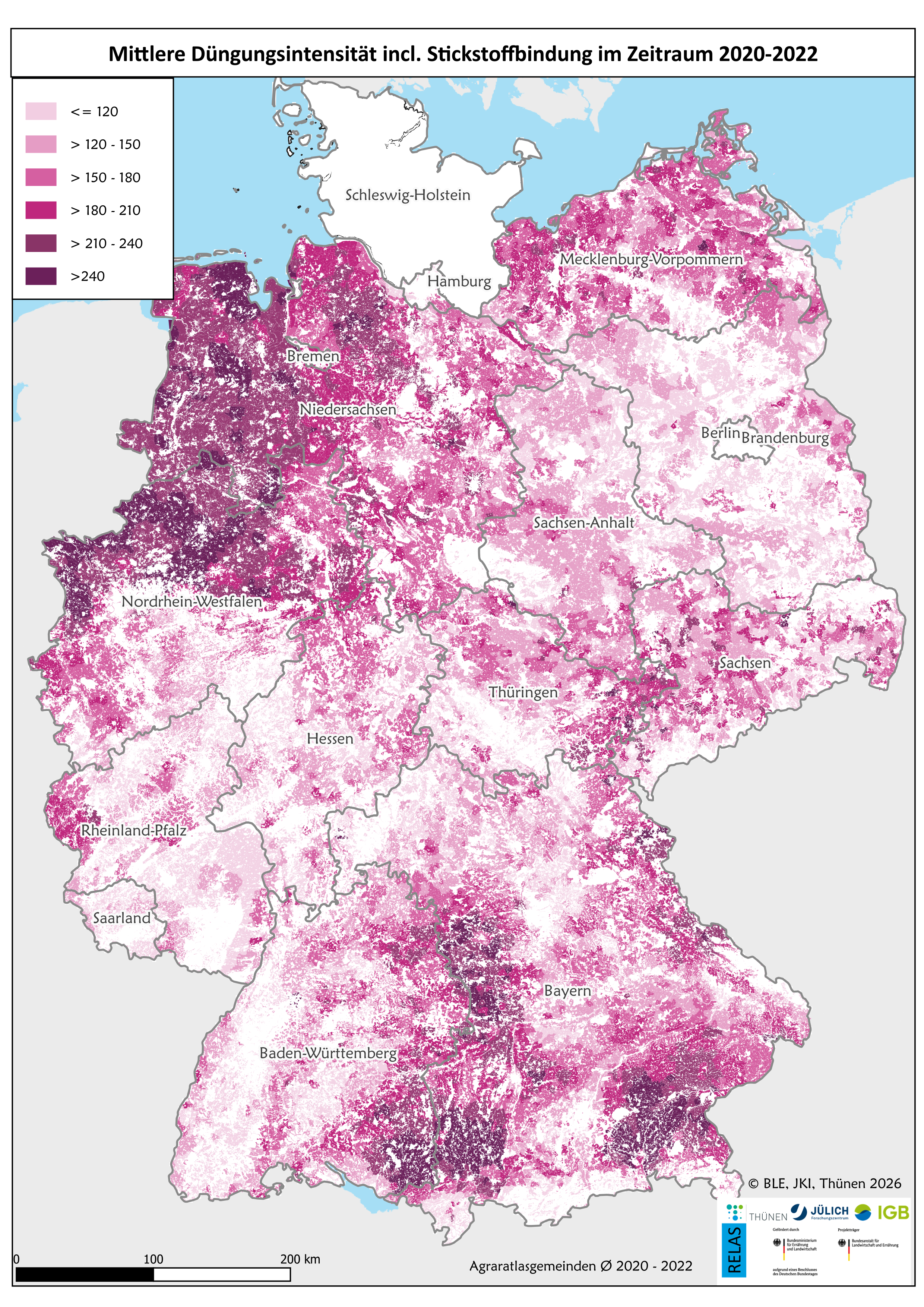 Intensive Düngung ist eine der Hauptursachen für den Rückgang der Artenvielfalt in der Agrarlandschaft. Hohe Düngungsmengen führen zu hoch- und dichtwüchsigen Pflanzenbeständen, die gegenüber wenig gedüngten Flächen mit einem lichteren Bestand eine geringere Biodiversität aufweisen. Die räumliche Verteilung und Entwicklung der Düngungsintensität sind Indikatoren für die Belastung von Flächen und Ökosystemen im Offenland mit Nährstoffen. Die Düngungsintensität kann sowohl als Gesamtintensität als auch in mineralische und organische Düngung (inkl. Gärreste) differenziert berechnet werden.