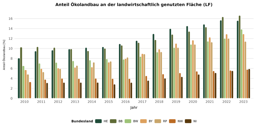 Insbesondere der Verzicht auf chemisch-synthetische Pflanzenschutzmittel und die geringere Düngungsintensität im Ökolandbau fördern eine höhere Biodiversität auf den Nutzungsfläche im Vergleich zur konventionellen Landwirtschaft. Dies gilt vor allem für den Ackerbau und den Anbau von Sonderkulturen. Der Verzicht auf leicht lösliche Mineraldünger und chemisch-synthetische Pflanzenschutzmittel führt zu einer geringeren Nutzungsintensität und Nährstoffversorgung auf ökologisch bewirtschafteten Flächen. Dies wirkt sich positiv auf die Habitatqualität aus. Der Anteil des Ökolandbaus an der landwirtschaftlich genutzten Fläche (LF) ist somit ein Indikator für Anzahl der Flächen mit einer potentiell höheren Artenvielfalt.